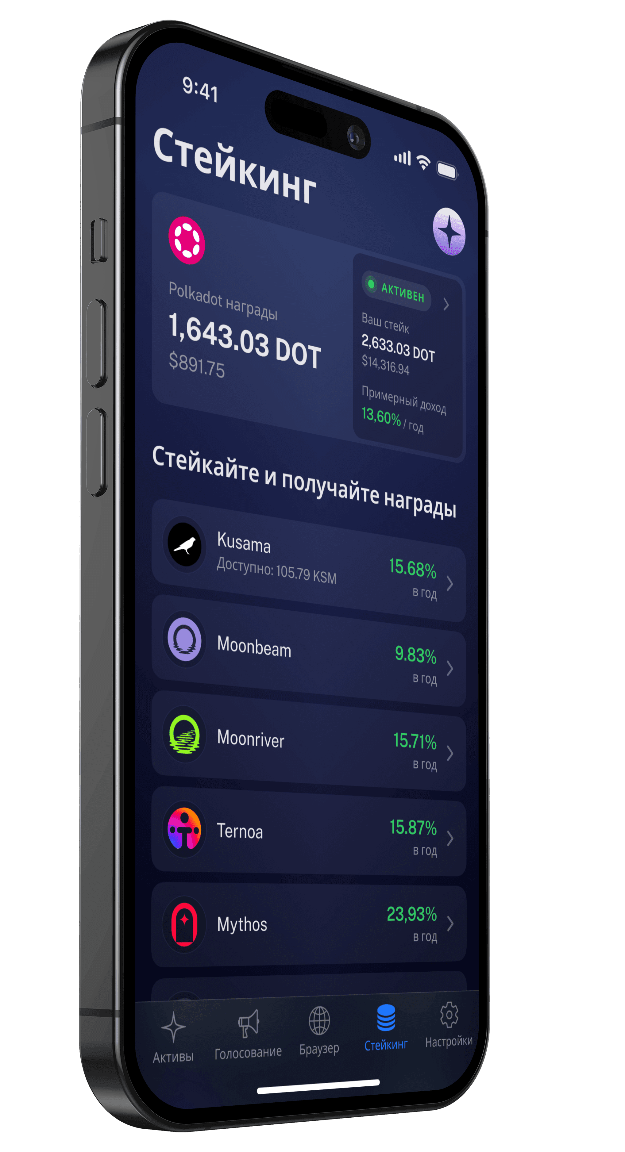 Nova Wallet — это некастодиальный кошелёк для Polkadot, который позволяет вам стейкать напрямую в блокчейне. Это самый безопасный способ стейкинга — без посредников, которые могли бы украсть ваши токены!